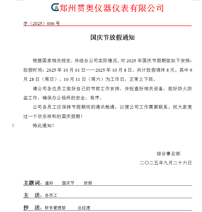 根據(jù)《國務(wù)院辦公廳關(guān)于 2025 年部分節(jié)假日安排的通知》精神,結(jié)合公司運(yùn)營實(shí)際,現(xiàn)將國慶節(jié)放假、福利發(fā)放及相關(guān)事宜通知如下: