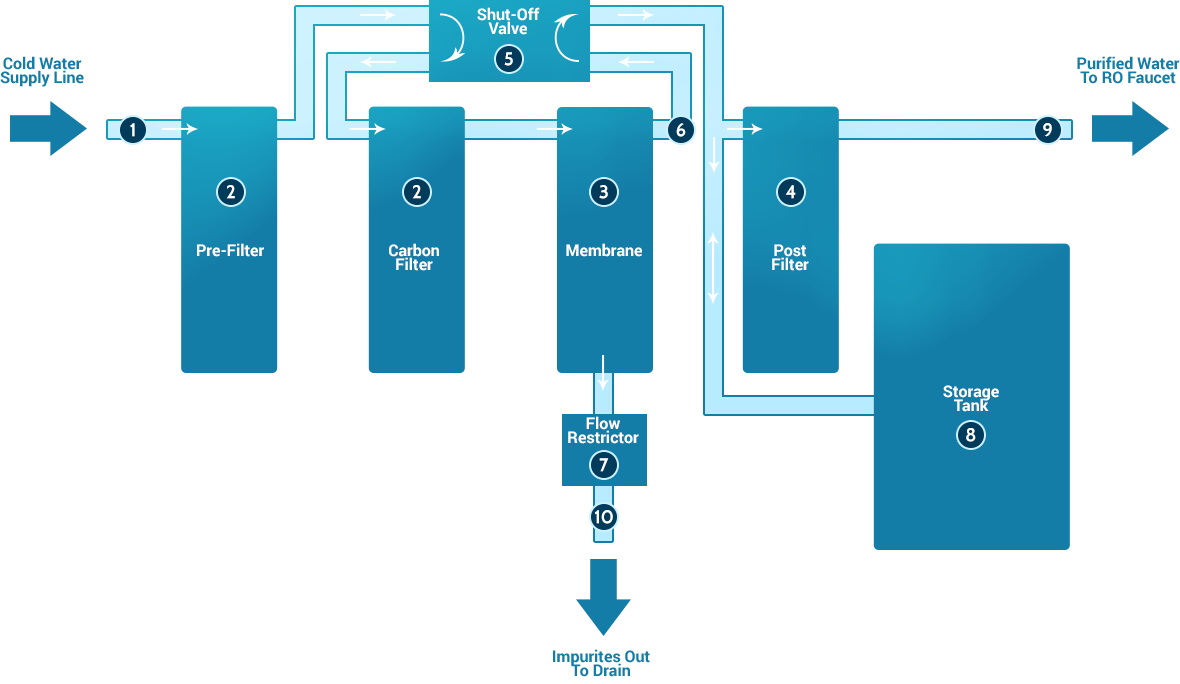 后過濾器: 水離開RO儲罐后,但在進入RO水龍頭之前,處理后的水經過最終的“后過濾器”。后過濾器通常是碳過濾器。通過后過濾“拋光”過濾器,從產品水中除去任何剩余的味道或氣味。