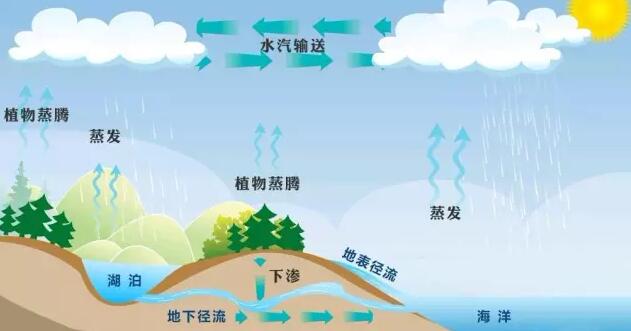 水體是水匯集的場所,按水體所處的位置,可粗略地將其分為地表水、地下水和海洋等三類。它們之間是可以相互轉化的。在太陽能、地球表面熱能的作用下,通過水的三態變化,水在不同水體之間不斷地循環著。